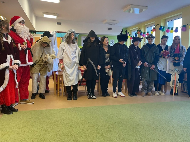 Przed świętami Bożego Narodzenia gościliśmy w naszym przedszkolu "Paneszki" - tradycyjną grupę kolędników - przebierańców. W barwnym korowodzie pojawili się m.in. kominiarz, diabeł, śmierć, bocian, niedźwiedź, koń i wiele innych przebierańców. Kolędnicy przynieśli nam dużo szczęścia, radości, życzeń, łącząc zwyczaje ze wspólną zabawą i śmiechem. Dziękujemy uczniom Szkoły Podstawowej w Pucku za kultywowanie zwyczajów kaszubskich.